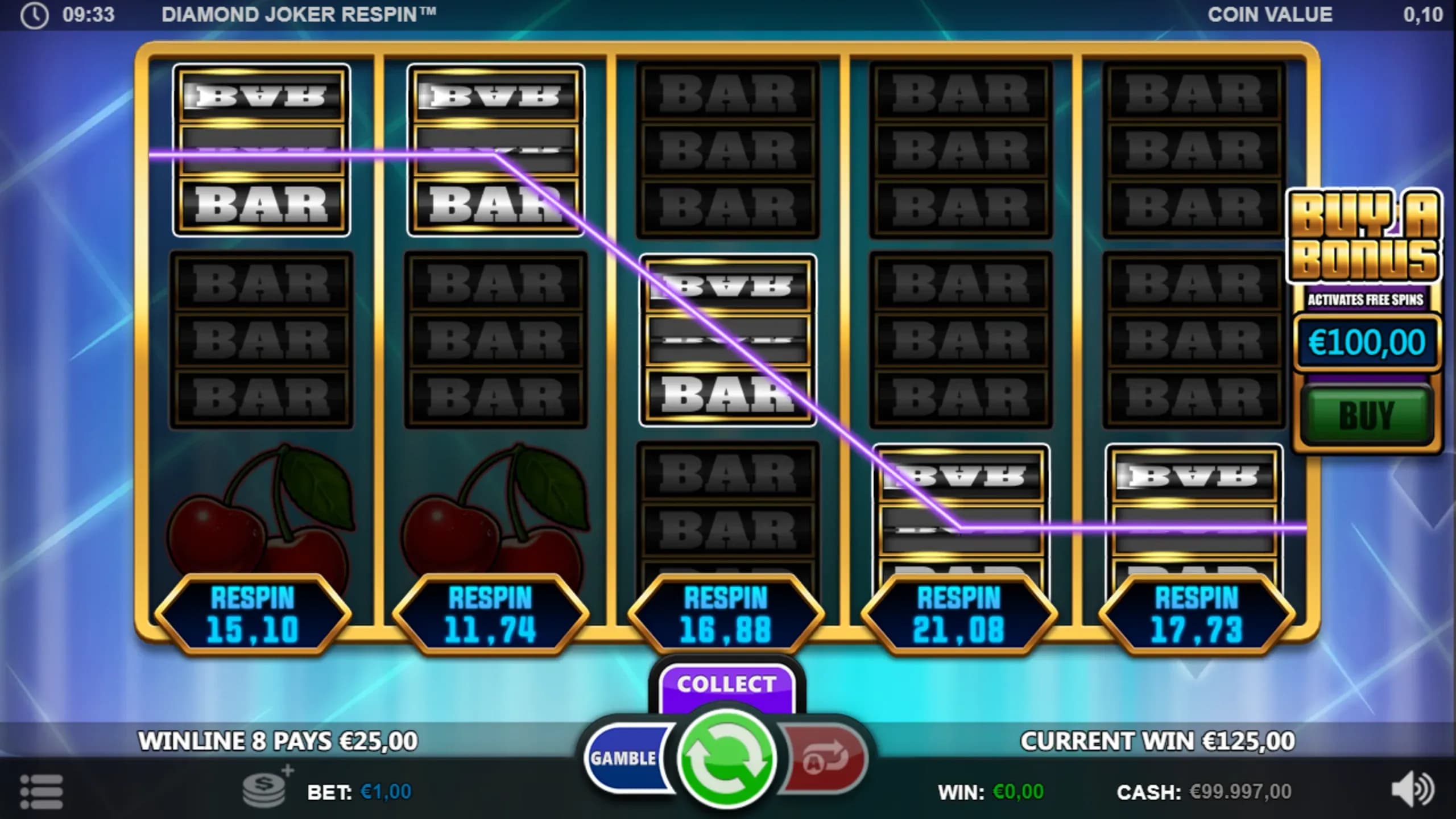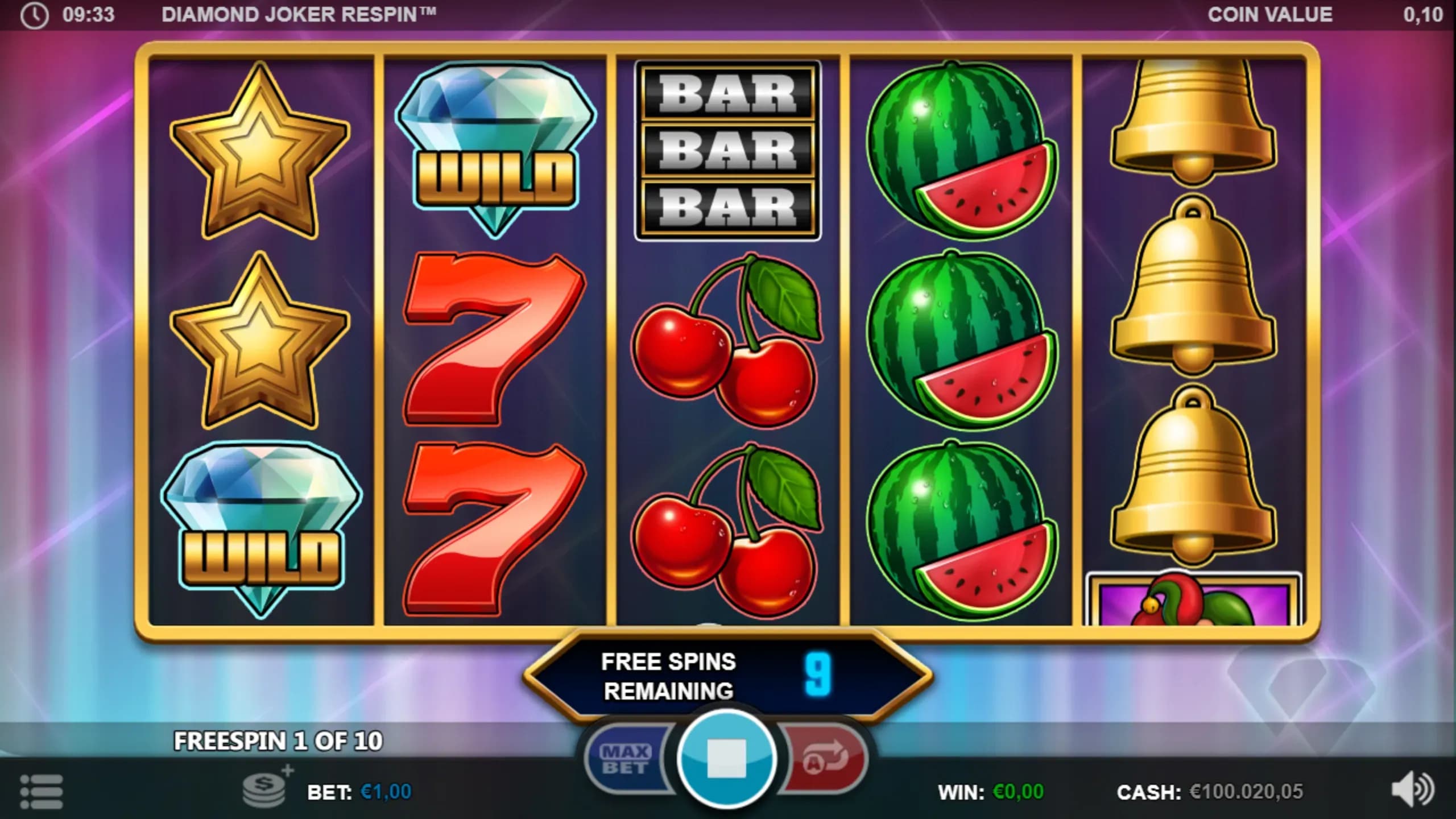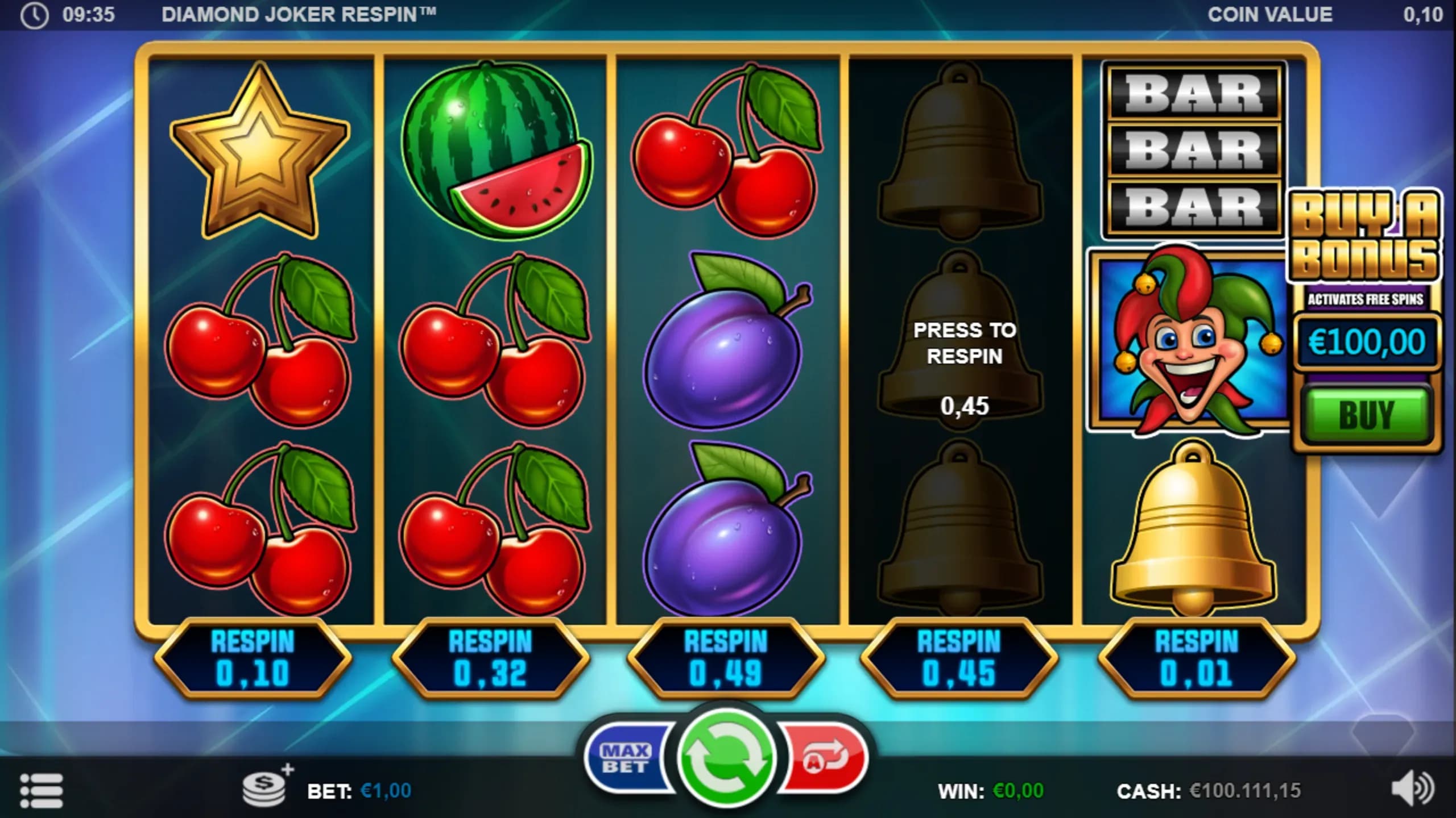 Play Diamond Joker Respin, a thrilling slot with 10 win lines, Diamond Wilds, and Joker Scatters. Trigger 10 Free Spins with Wild Jokers, buy a single-reel Respin, gamble wins up to 500x, or instantly access the bonus with Buy a Bonus.