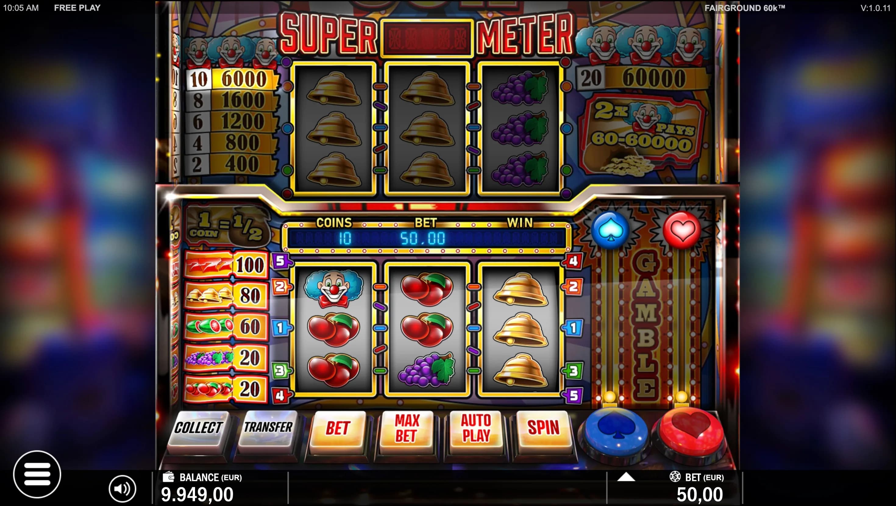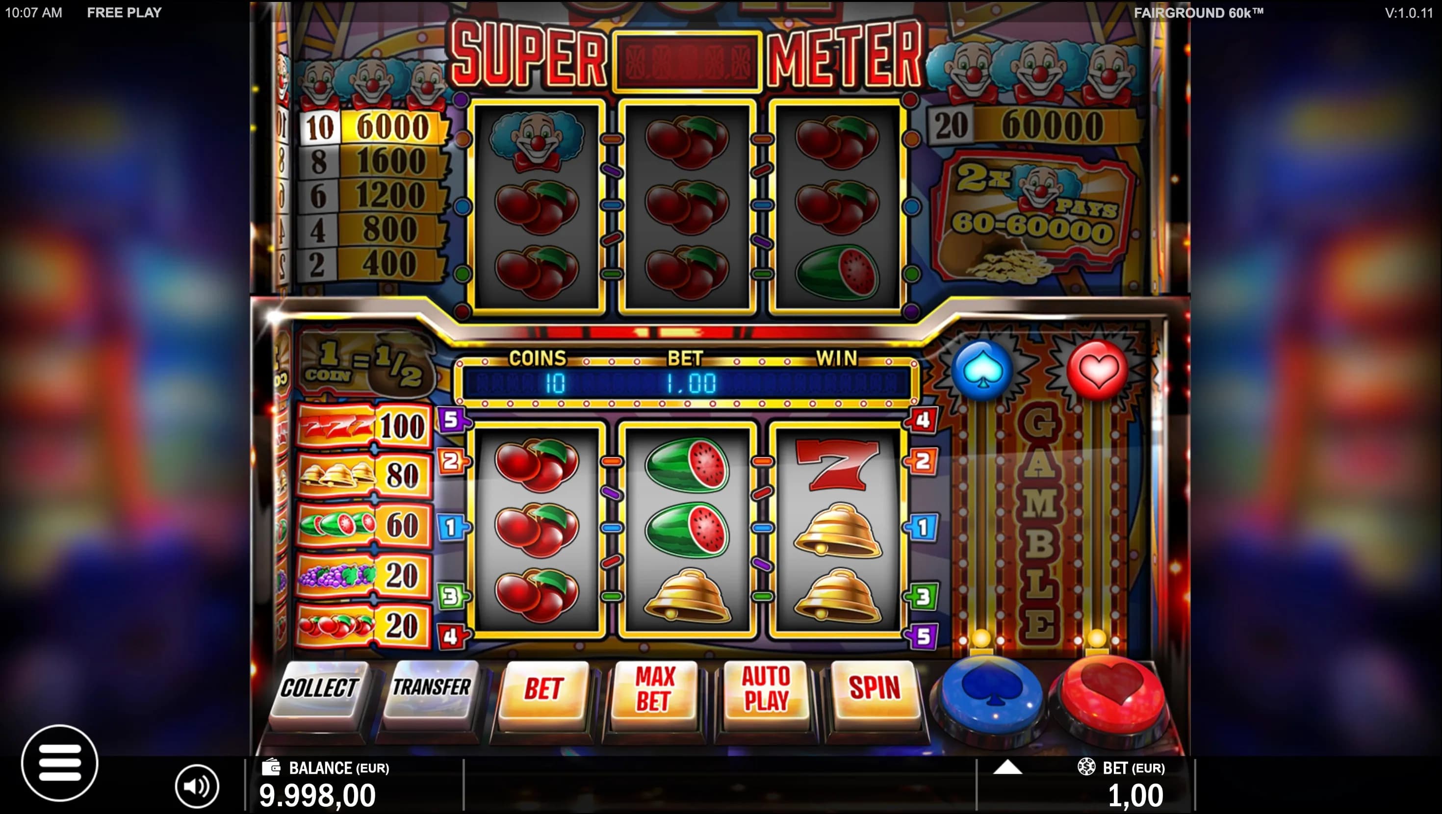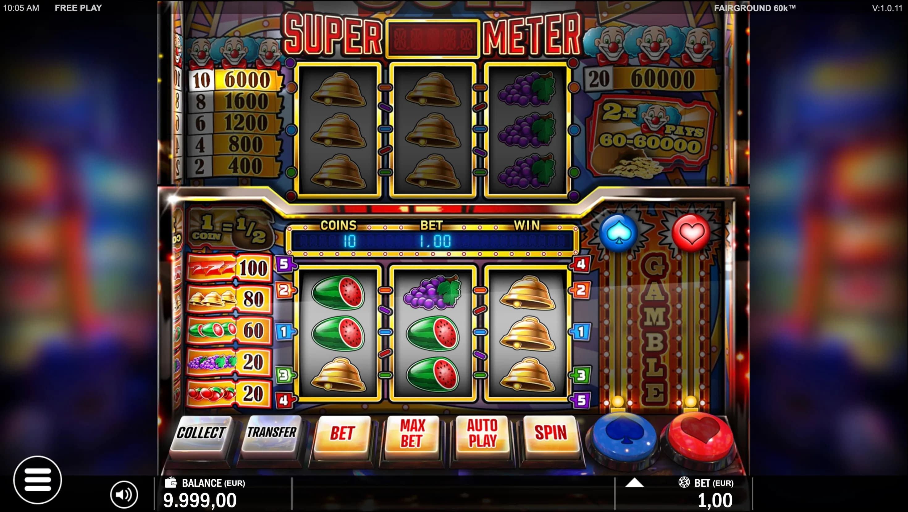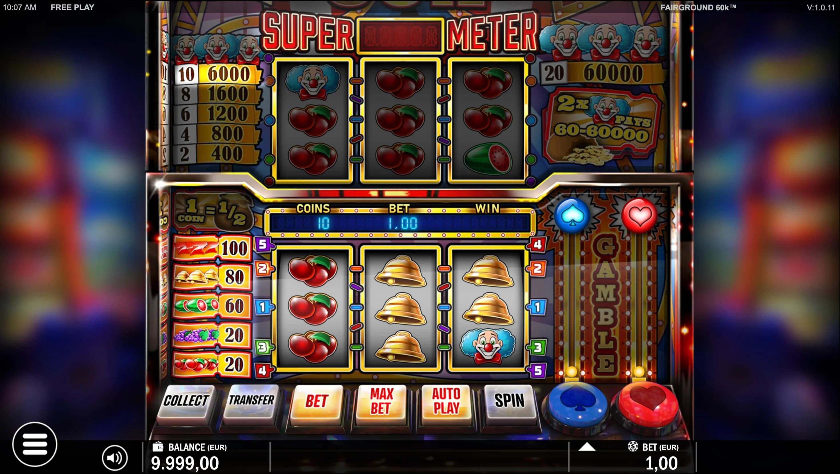 Fairground 60K - Step right up to classic 3-reel excitement! Play 1–5 win lines, gamble wins to double, or transfer prizes to Supermeter Mode for enhanced five-line play, lucrative Mystery Wins of up to 60,000 coins, and thrilling Joker jackpots.