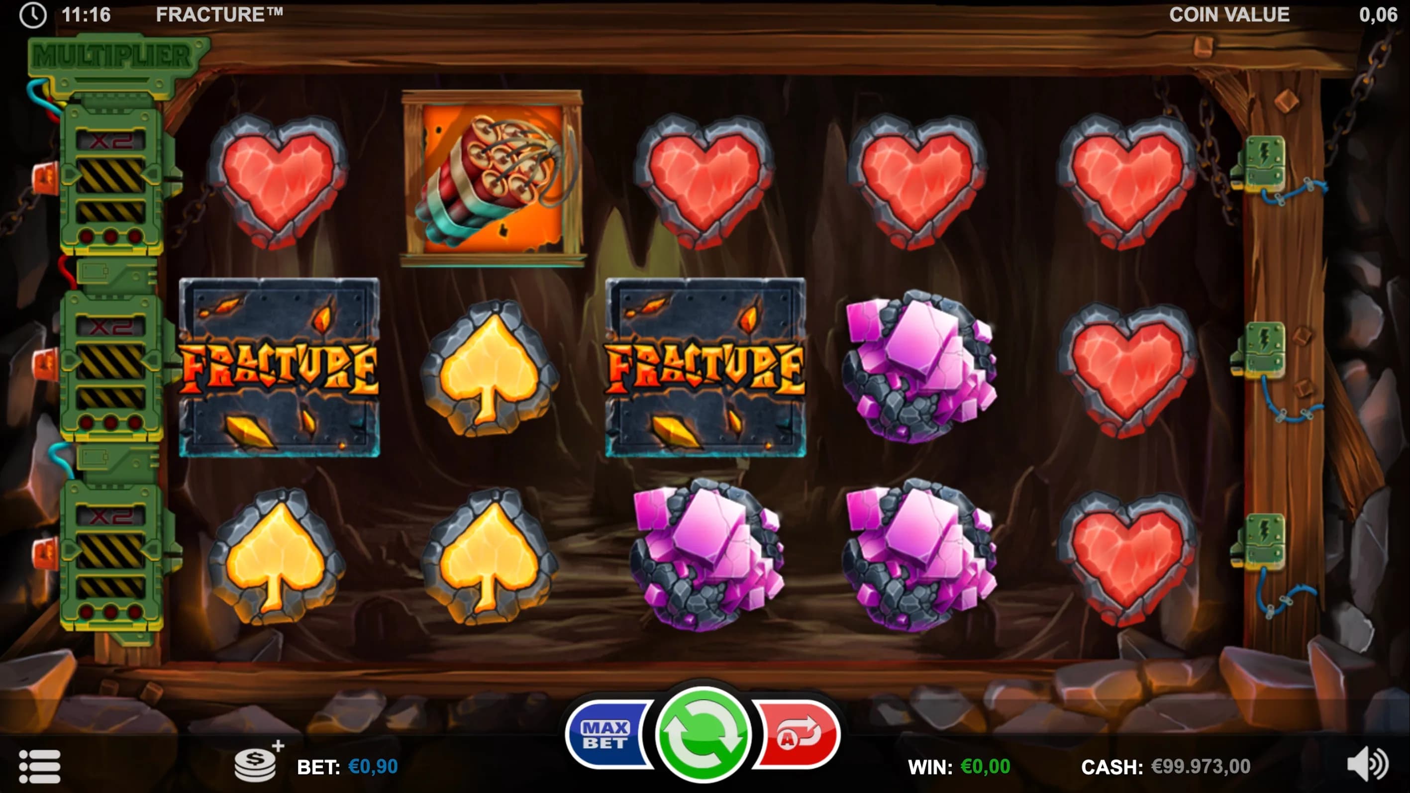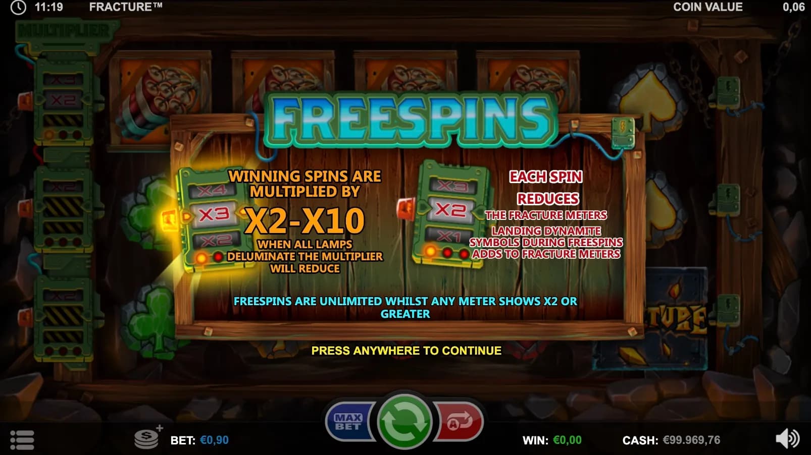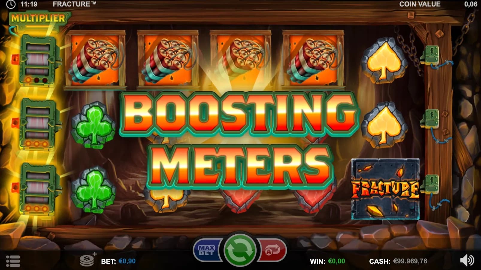 Dig deep for explosive wins in Fracture! Charge Dynamite Scatters to power massive multipliers, trigger Unlimited Free Spins, and shatter symbols for cascading, chain-reaction rewards with every spark and spin!