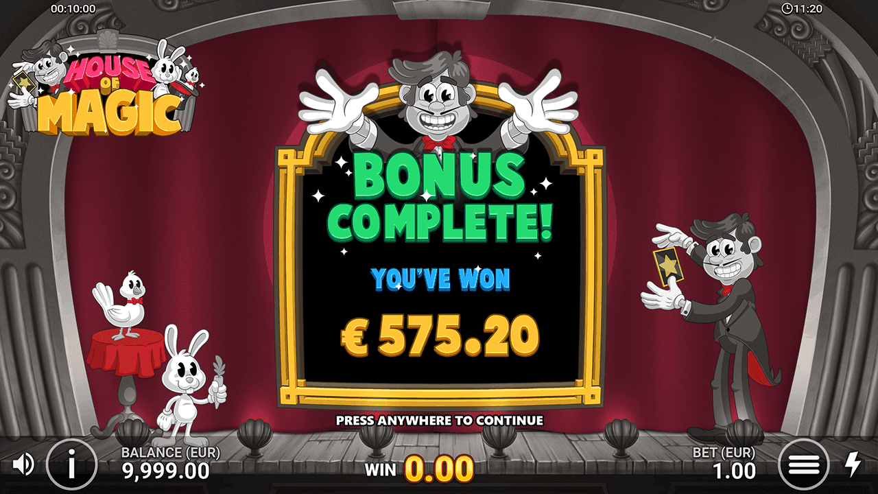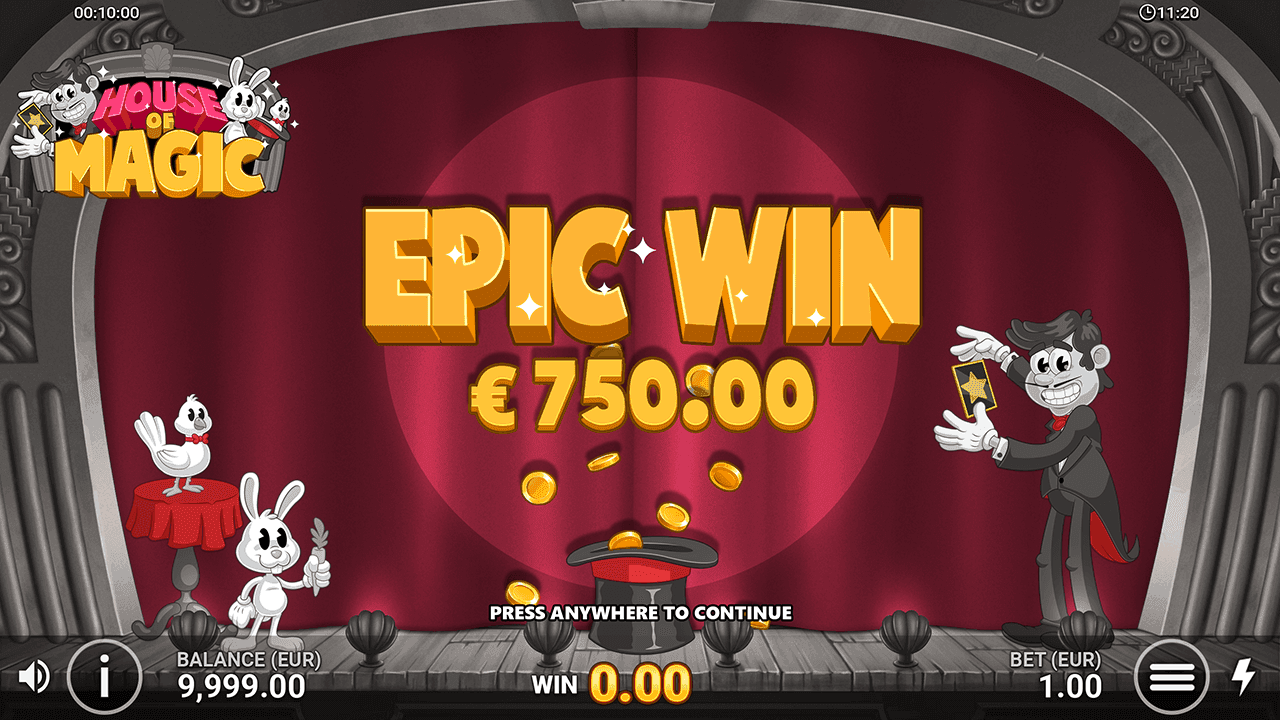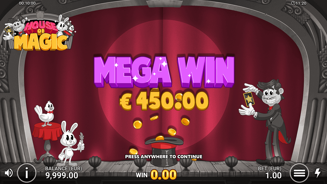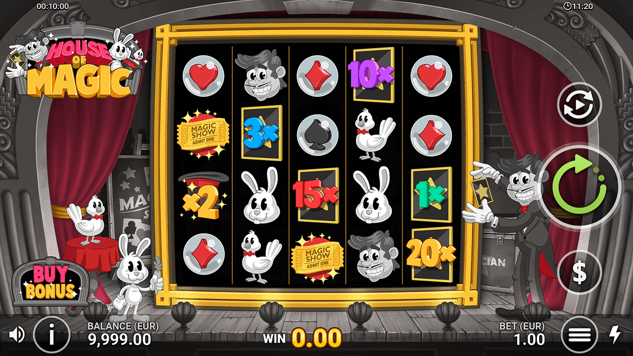 Enter the world of House of Magic™, where the stage is set, the curtain rises, and every spin is a spellbinding spectacle! Collect Playing Cards that add up your fortunes, and watch Top Hats multiply your wins with a flick of their magical brims.