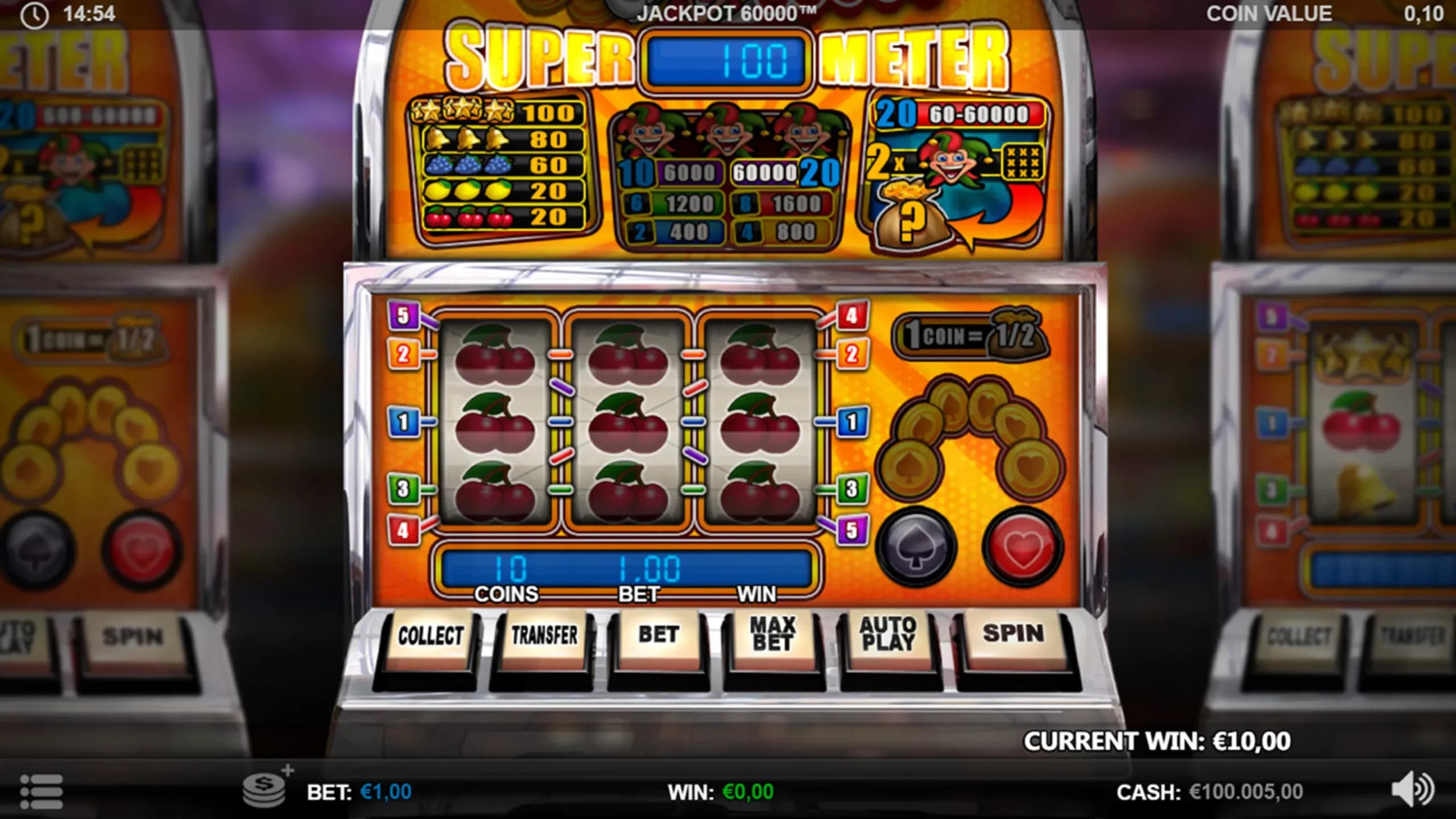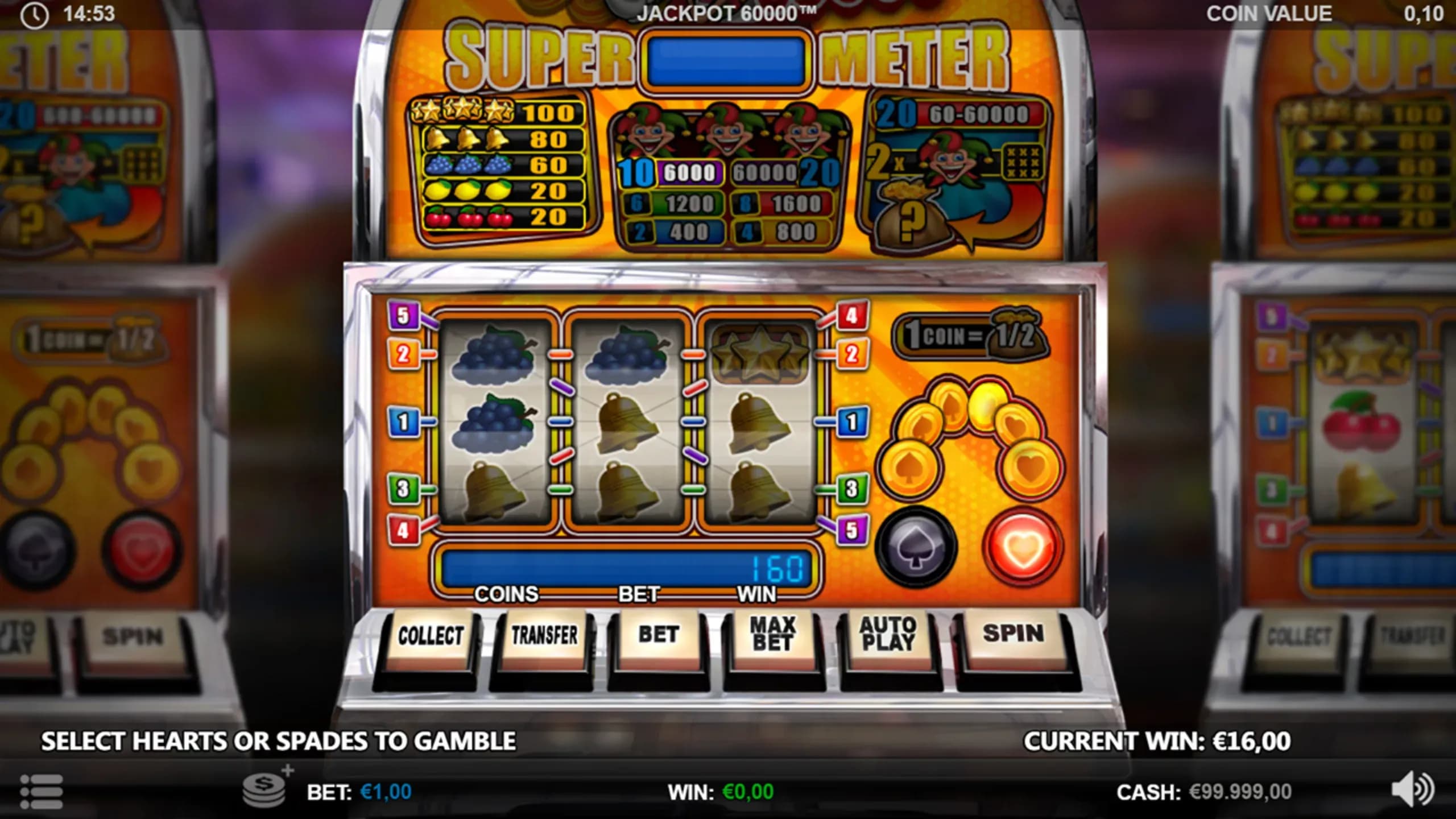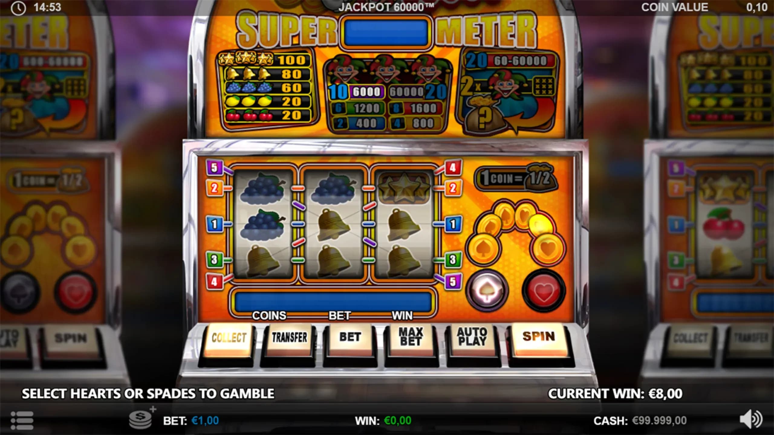 Spin Jackpot 60000, a classic 3-reel slot with up to 5 win lines. Gamble wins to double, unlock Supermeter Mode, and land 2+ Jokers for Mystery Wins or 3 Jokers to hit the ultimate 60,000-coin jackpot.