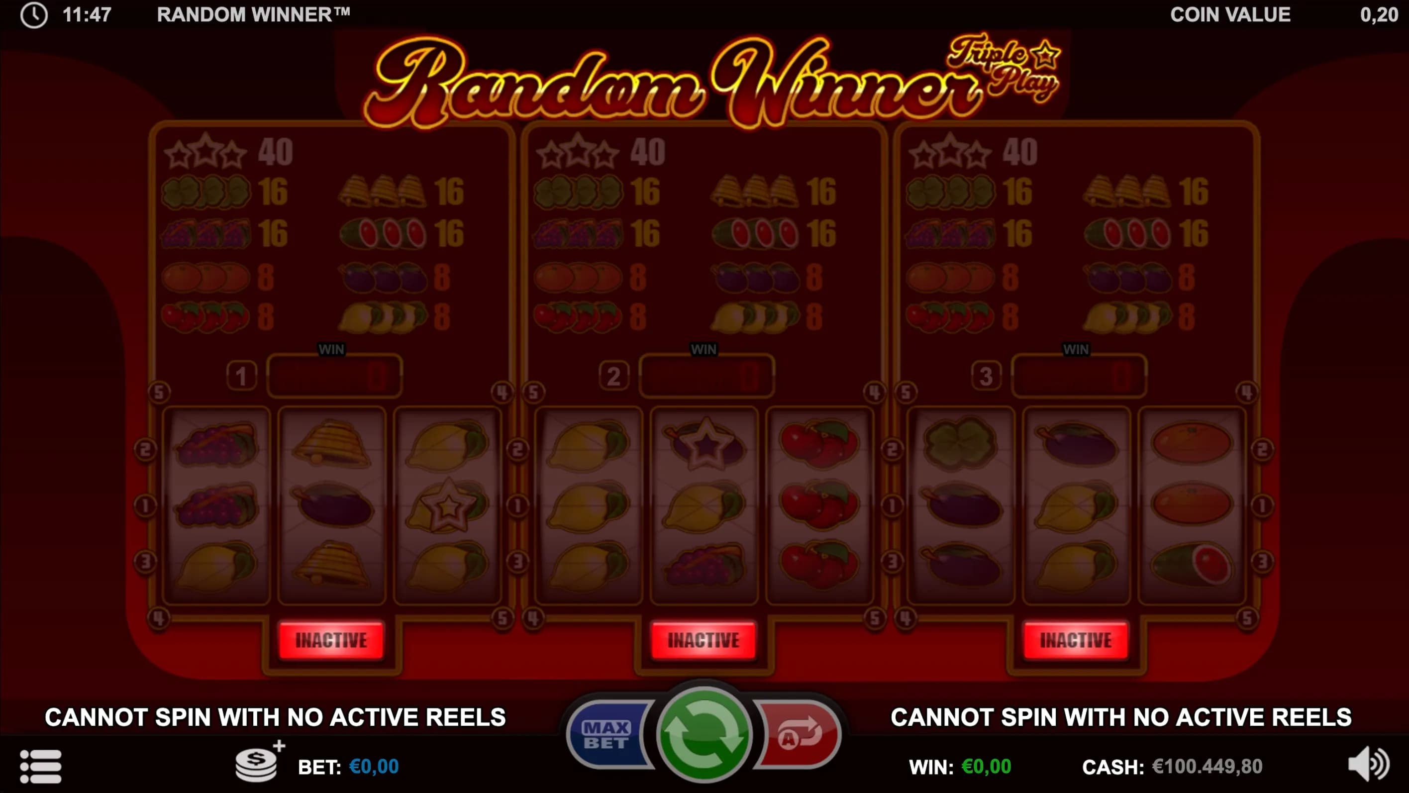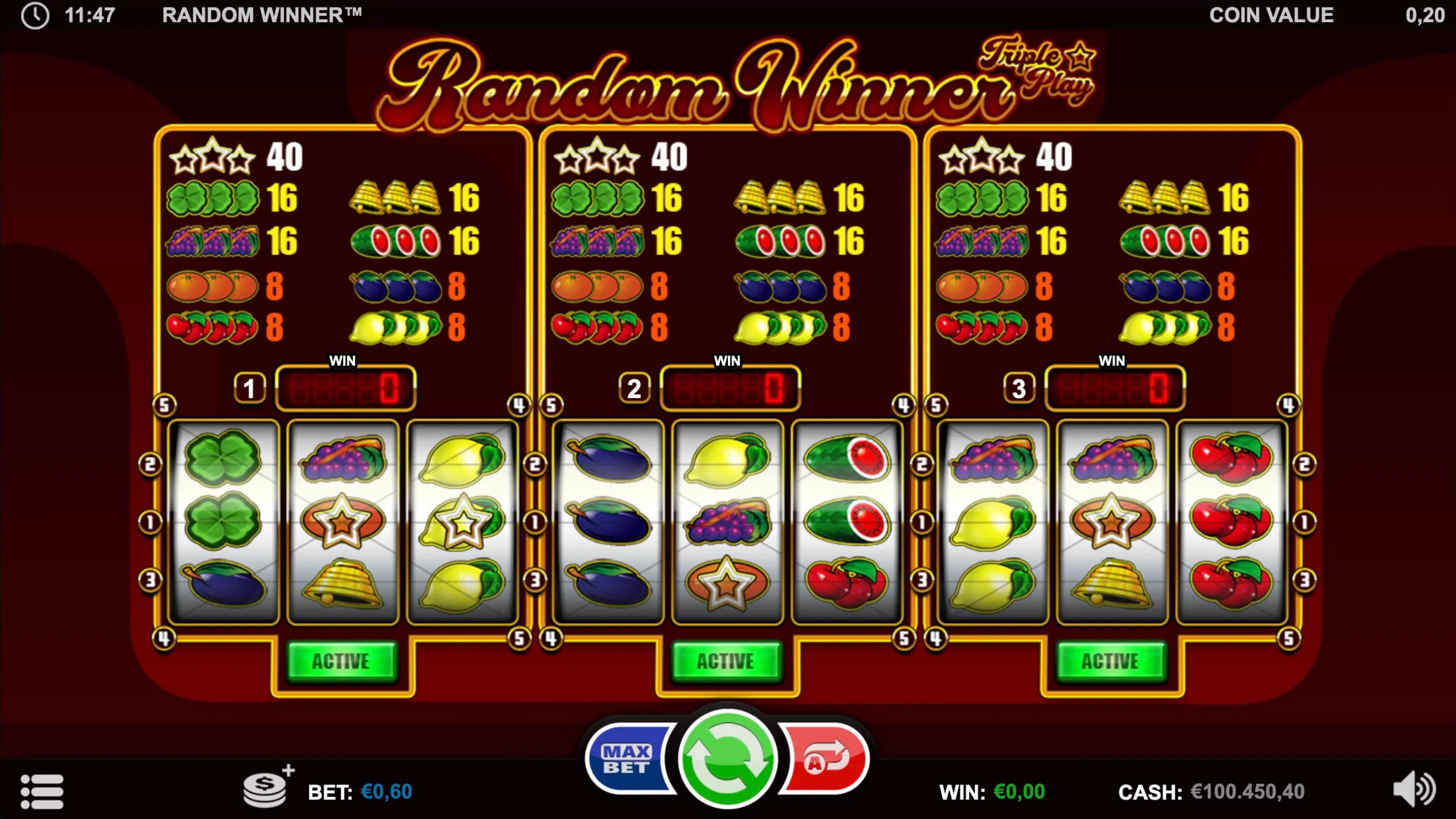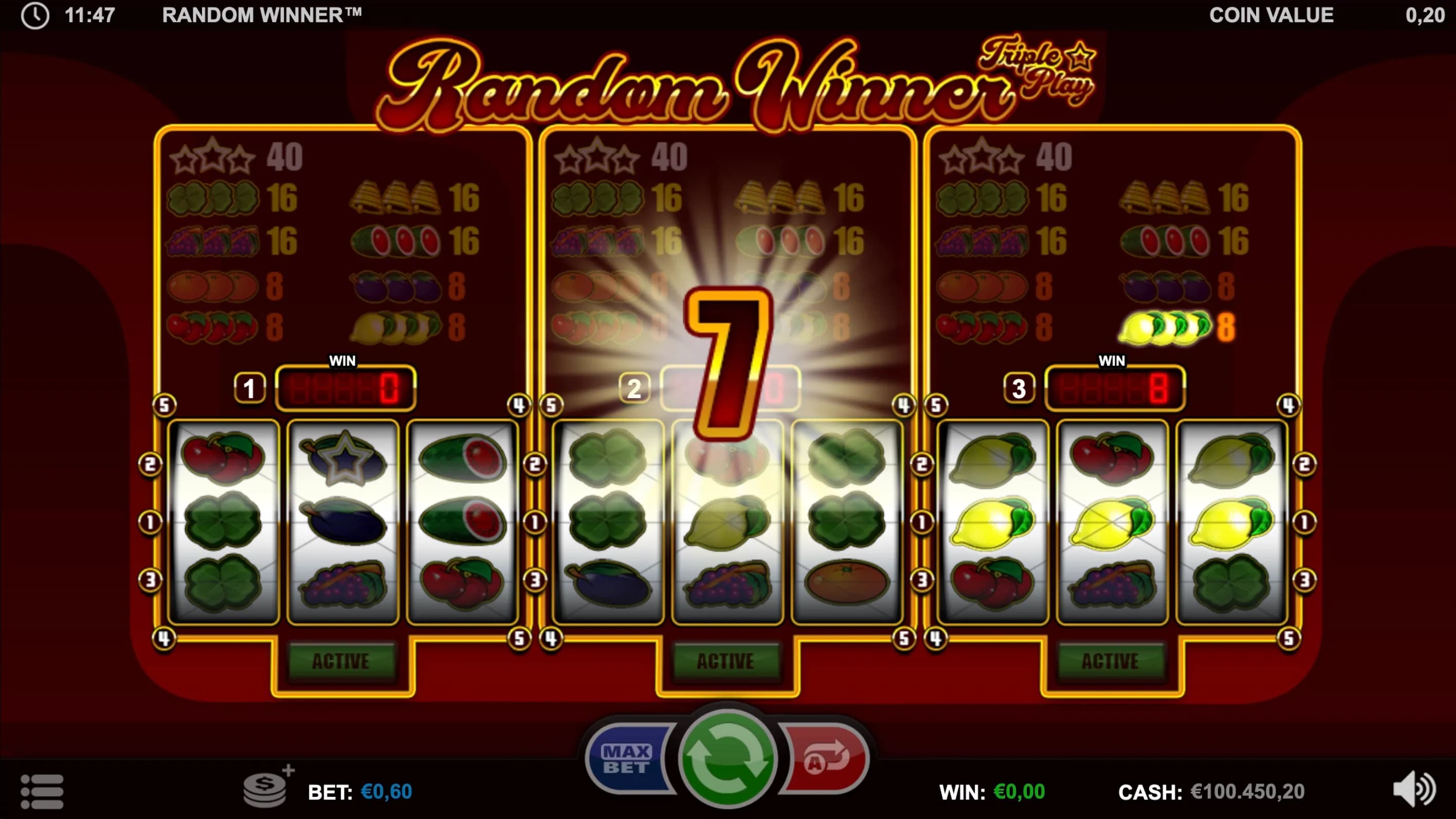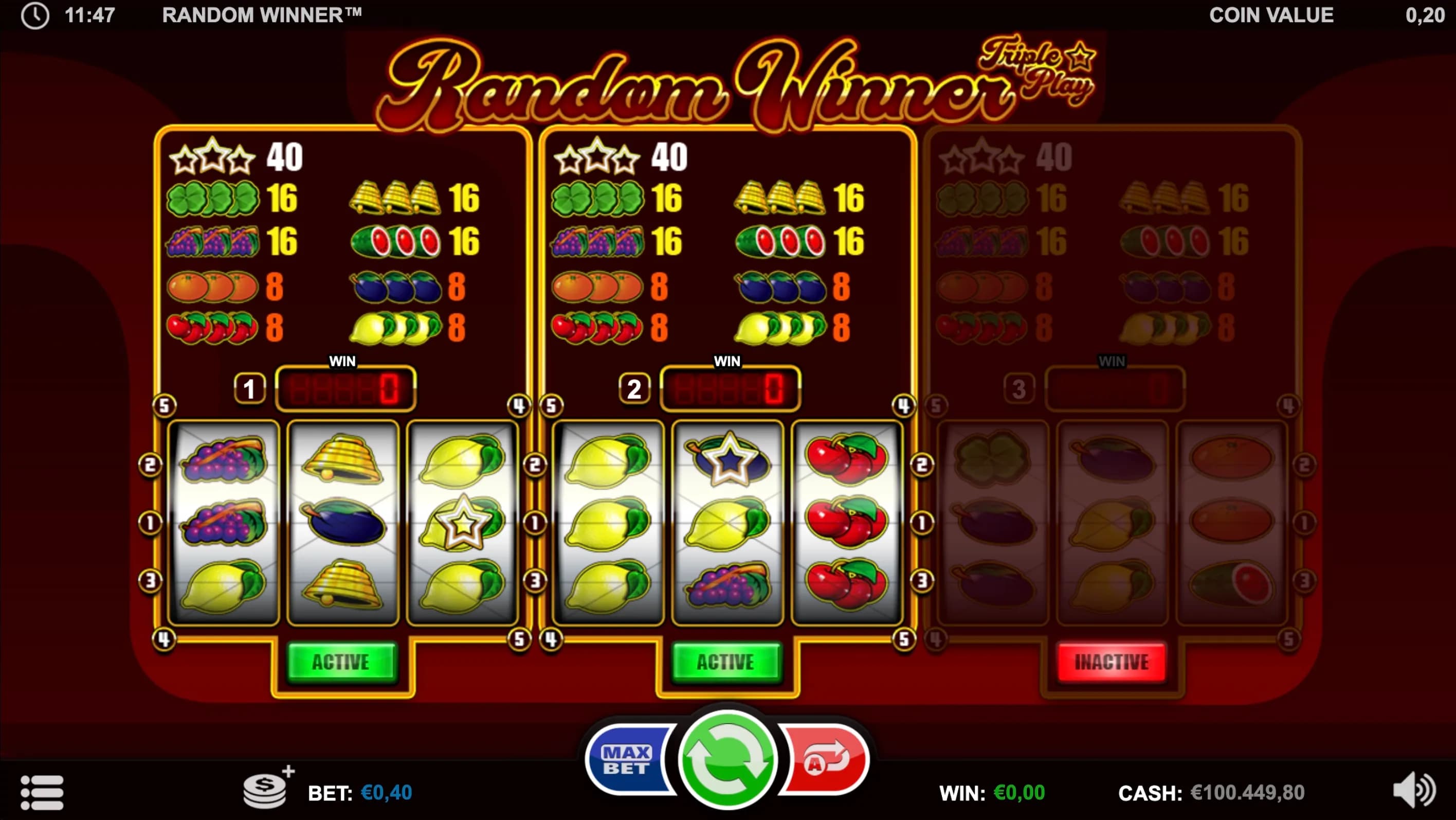 Light up the reels in Random Winner - Triple Play, a vibrant 3-reel classic where up to three games run at once! Land matching fruits or shining Star Symbols for big wins and watch your cumulative meters burst with triple the rewards.