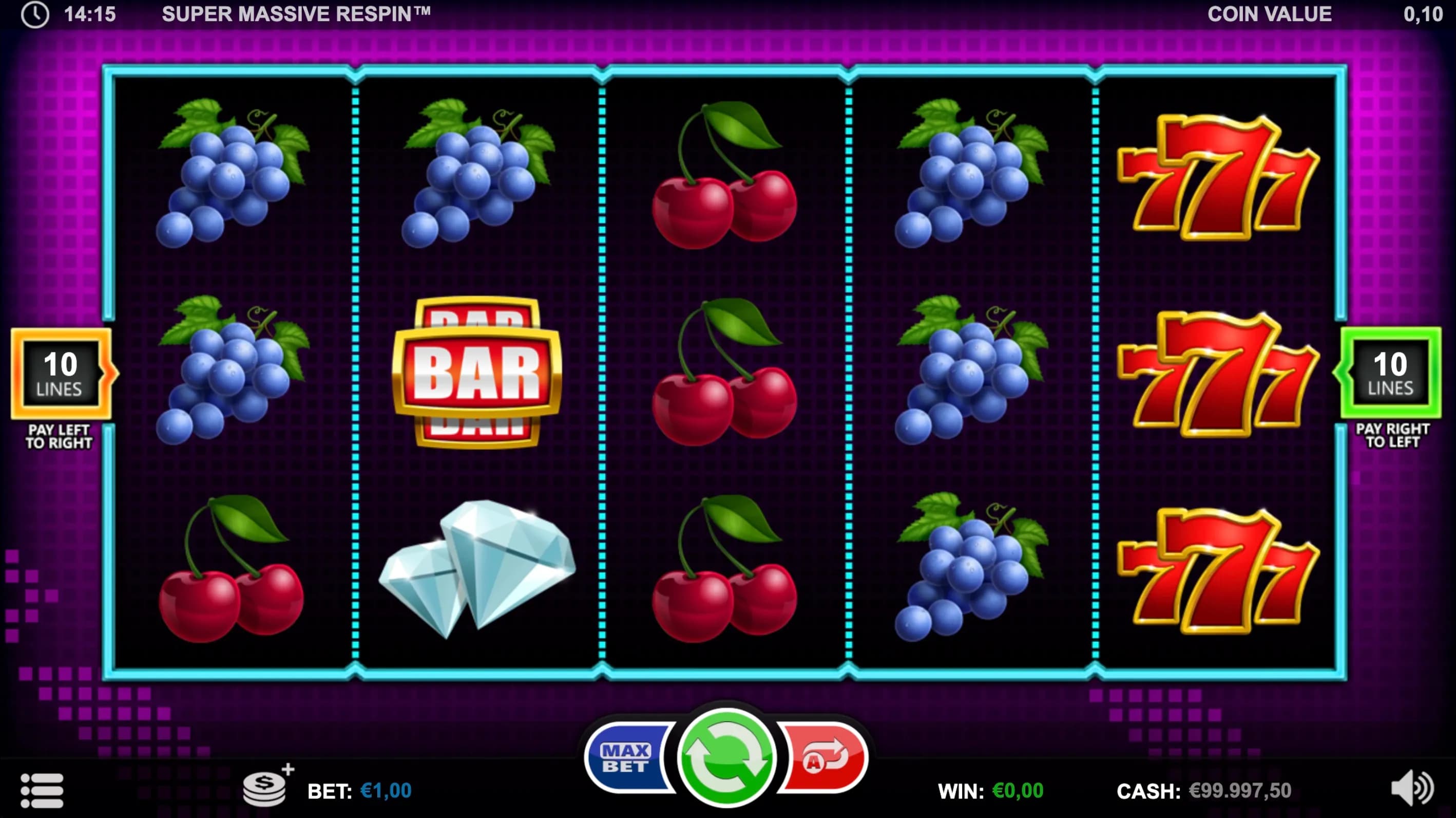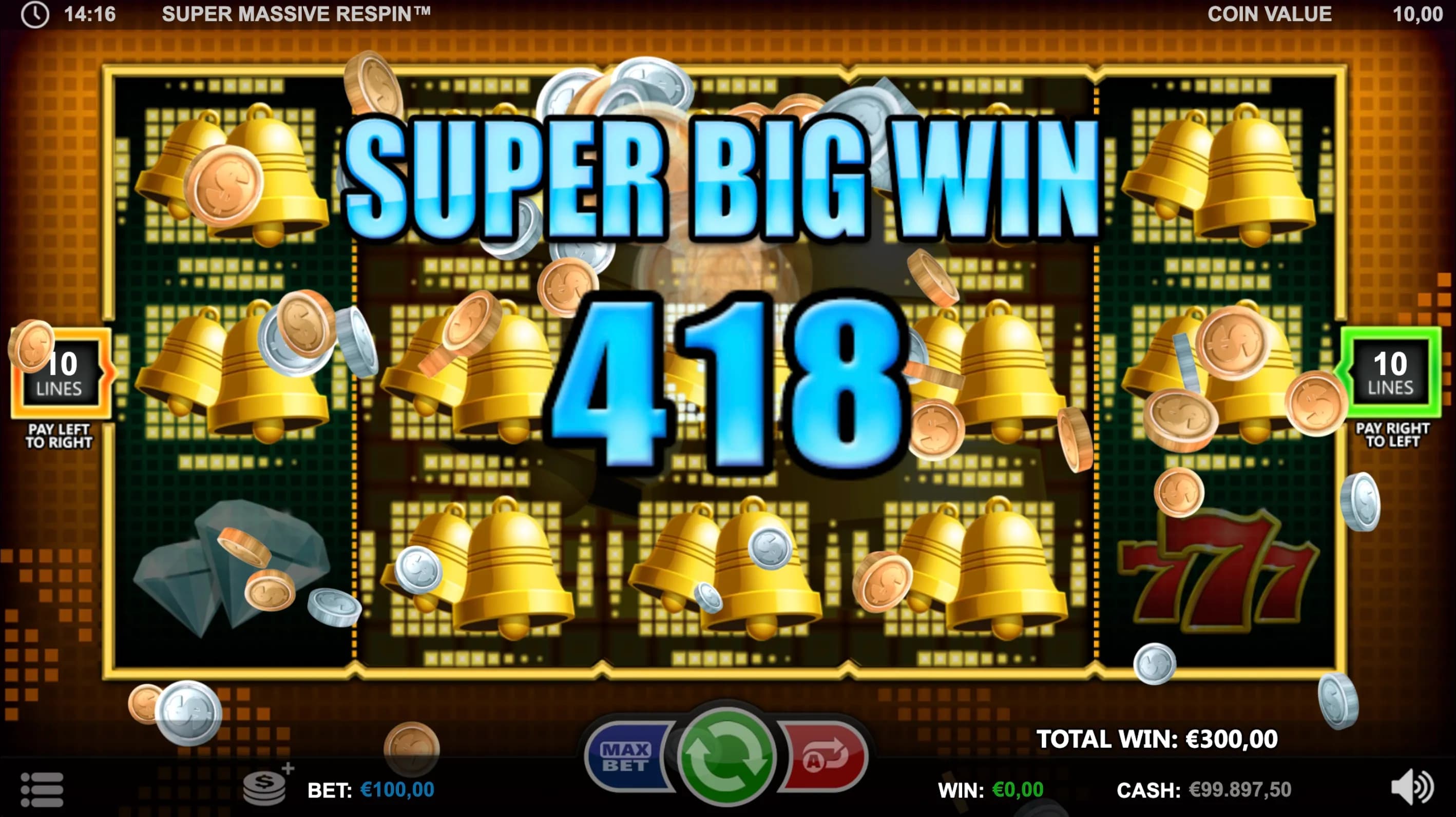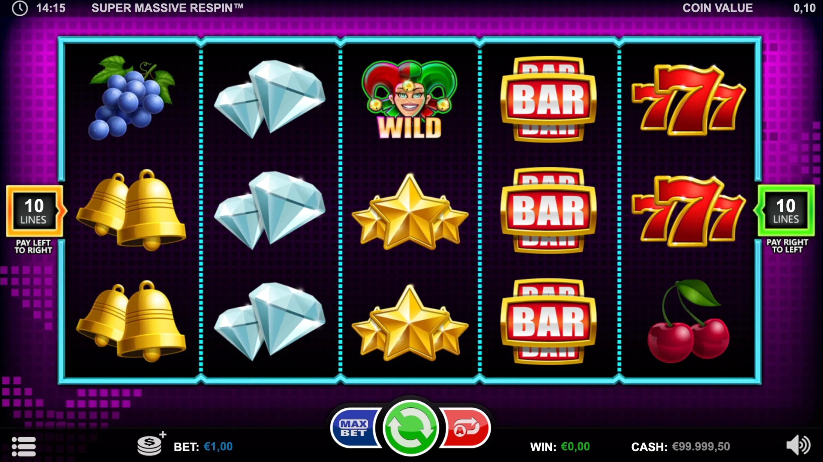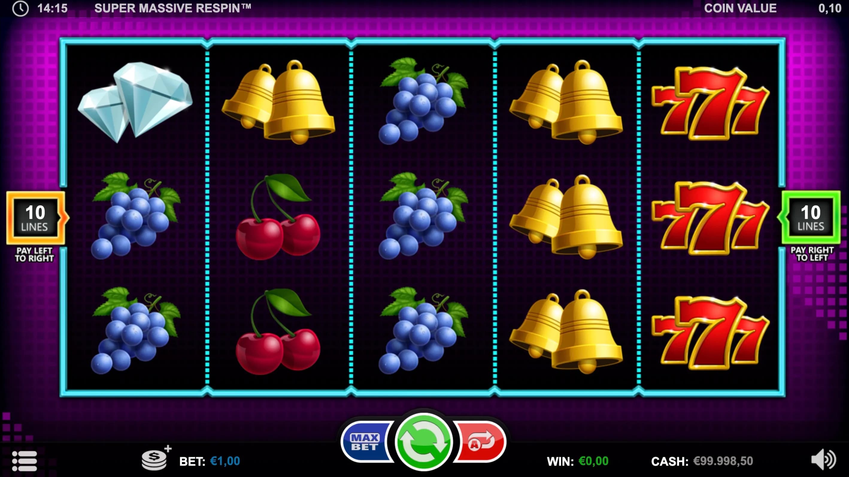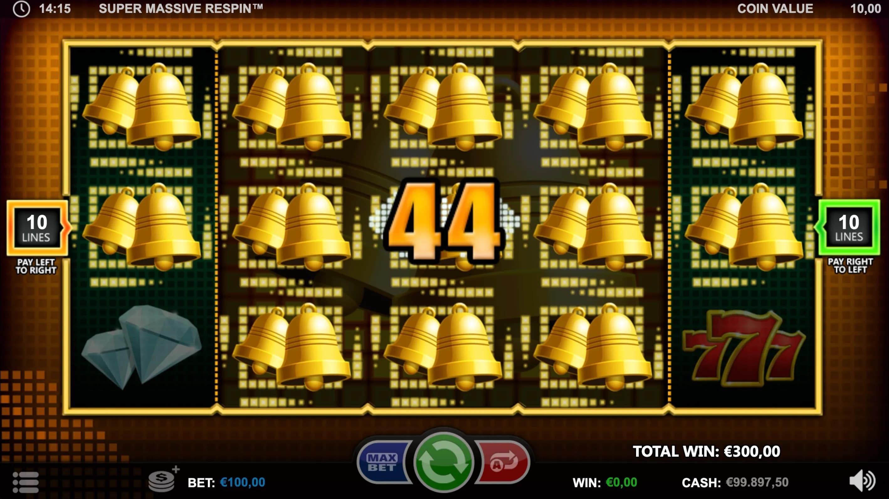 Super Massive Respin erupts with energy as this 5-reel, 10-line slot pays both ways. Trigger the colossal Respin Bonus to unleash a towering 3x3 symbol while surrounding reels spin again, chaining together huge, screen-filling wins.