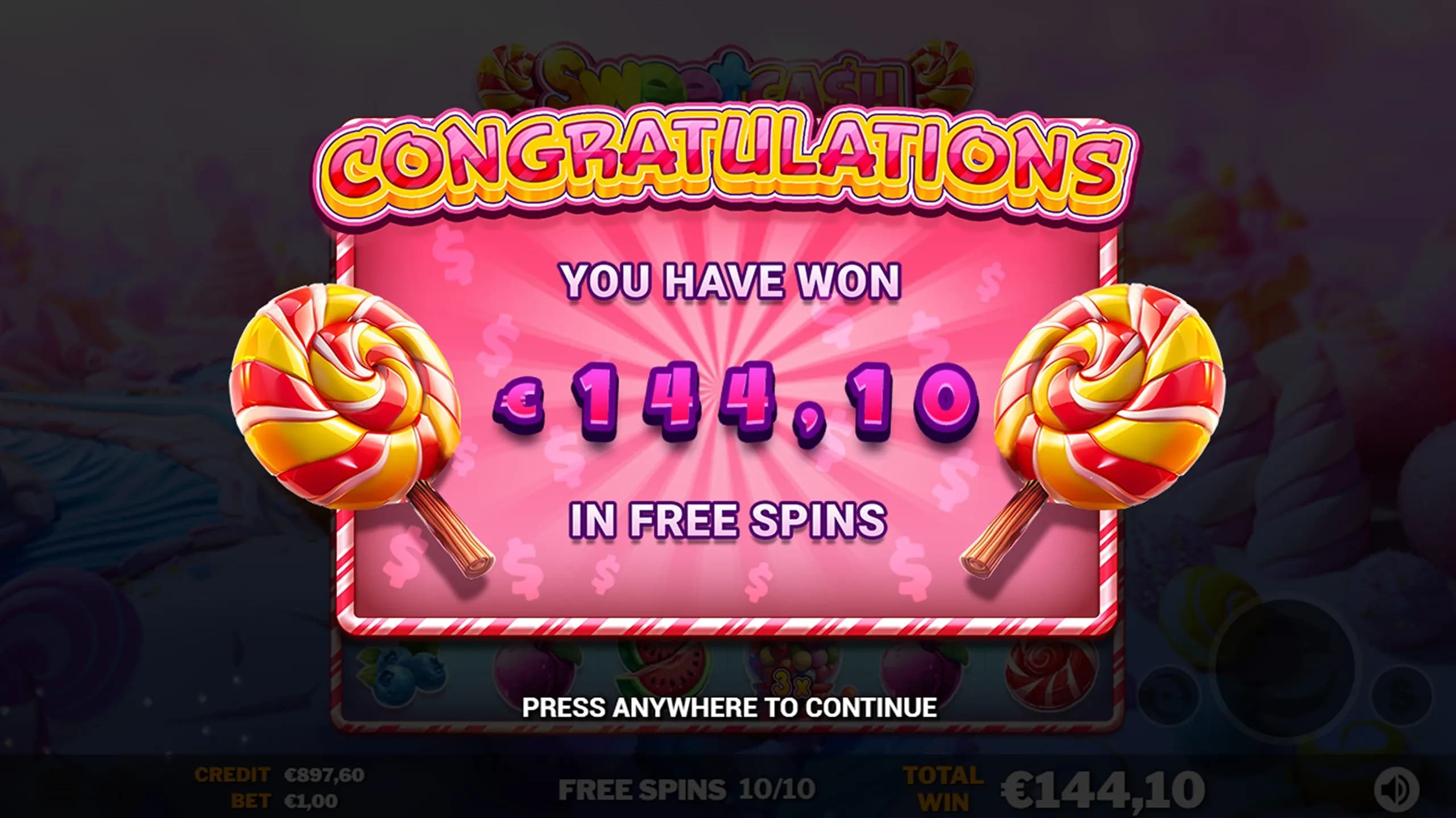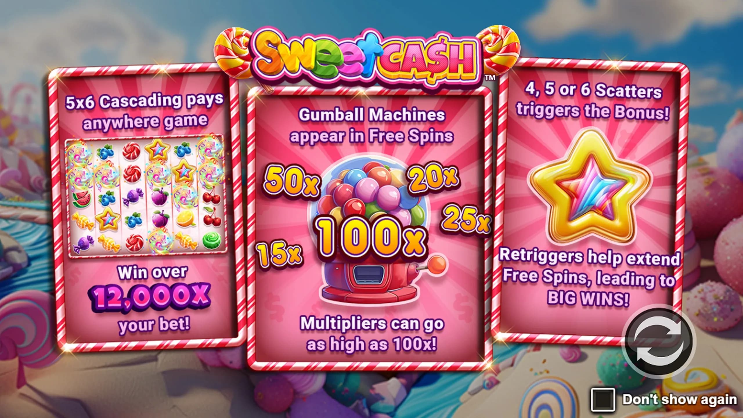 Enjoy Sweet Cash, a 5x3 candy-themed slot with cascading wins and pays-anywhere mechanics. Trigger free spins with multipliers up to 100x, or boost your chances for sugar-sweet big wins using the Buy Bonus and Super Bet features.