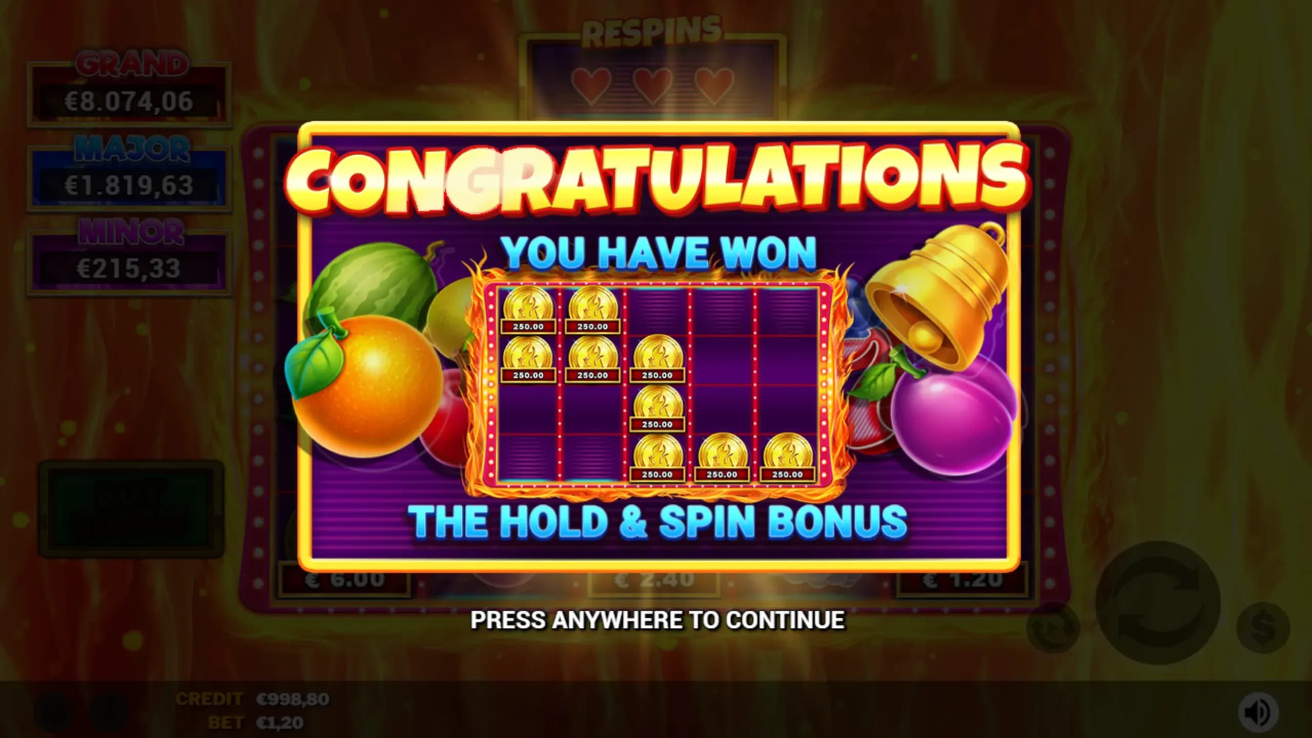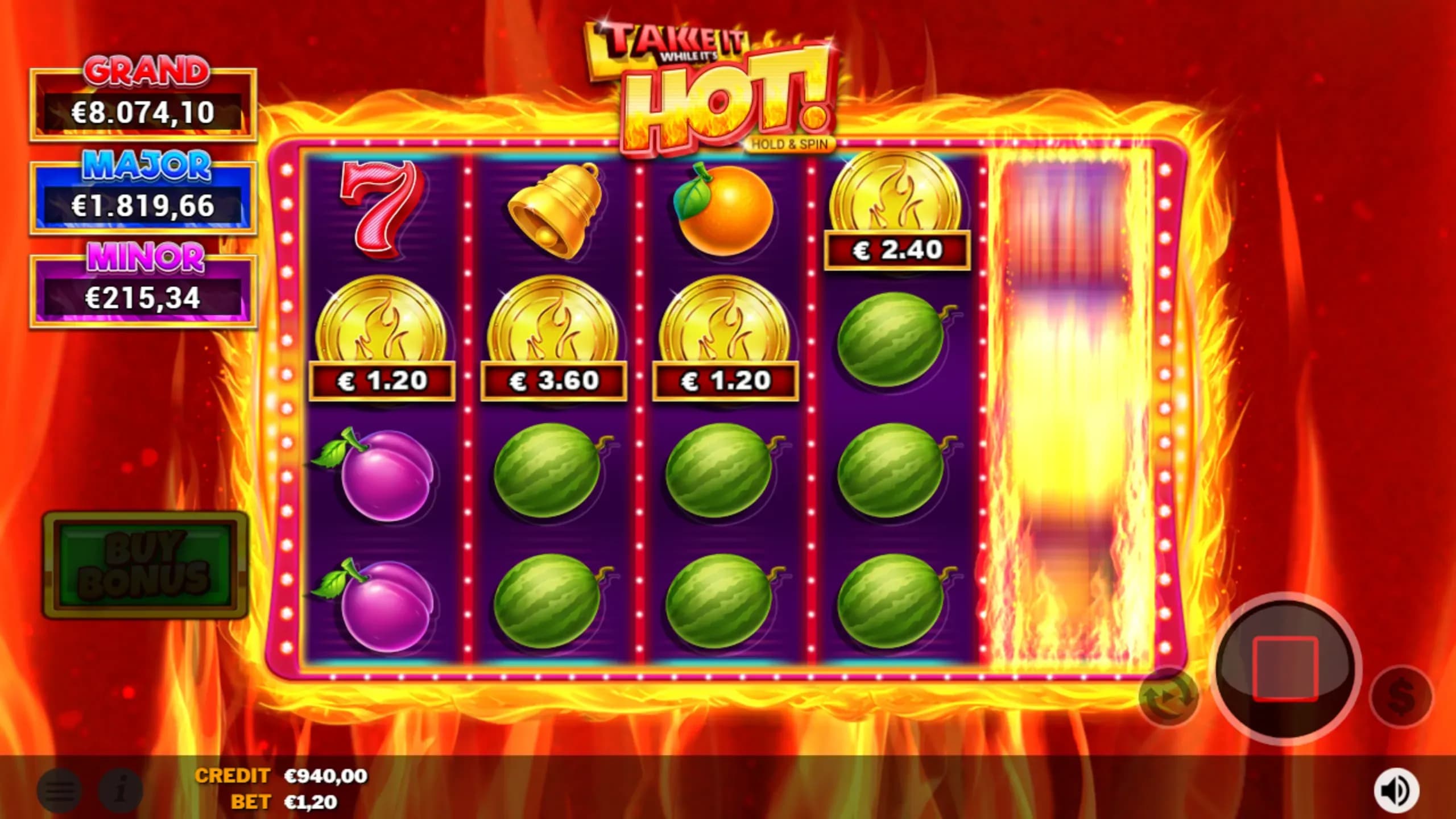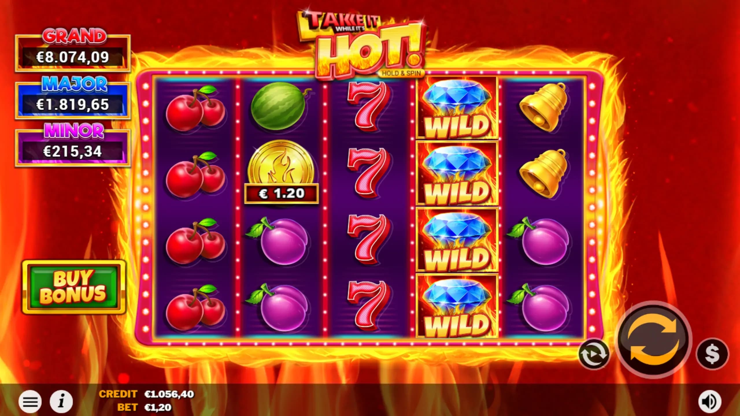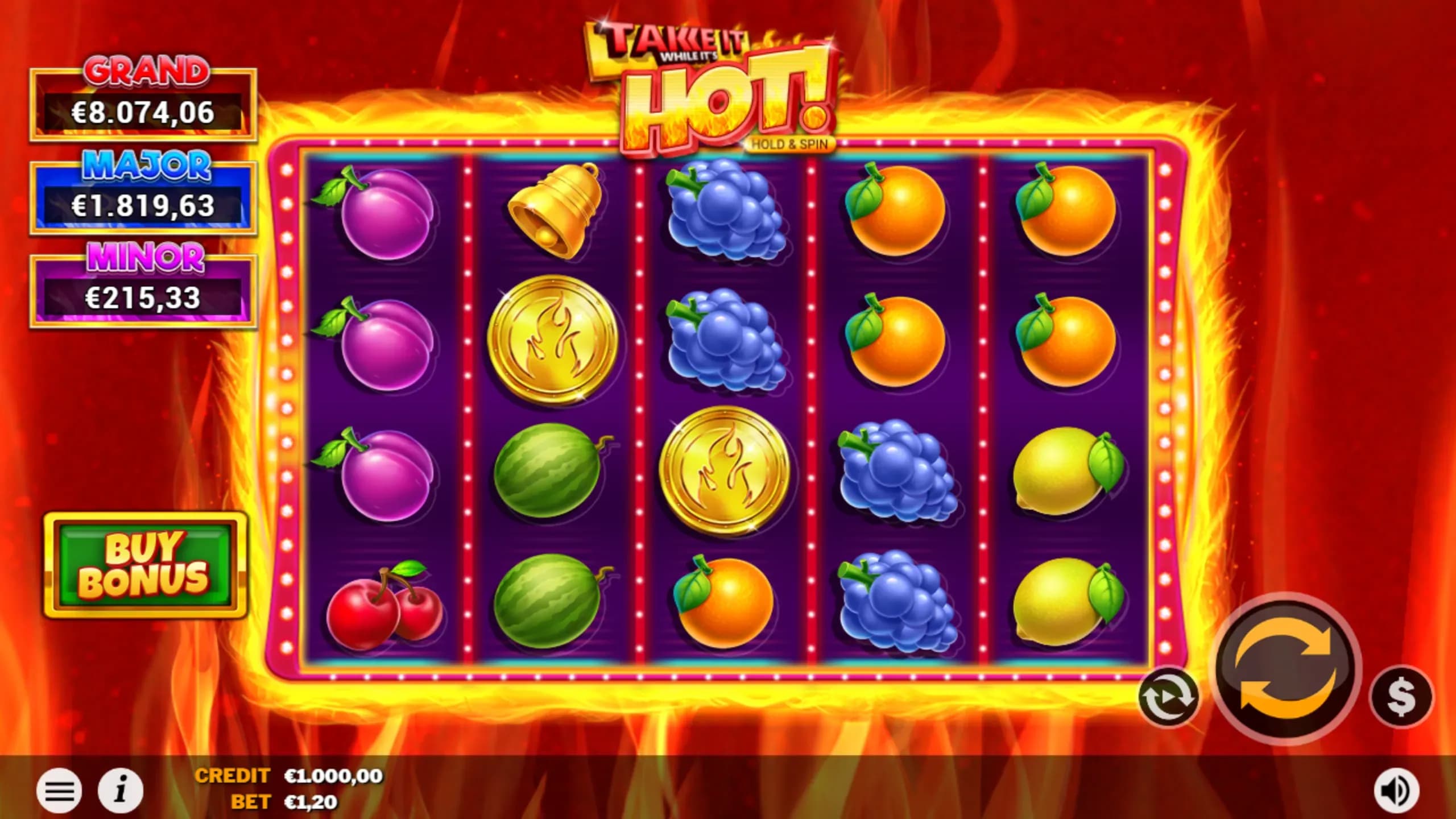 Take It While It’s Hot! is a 5x4, 40-line fruit slot with expanding wilds, cash scatters, and a hold-and-spin coin bonus. Trigger progressive Jackpots anytime while chasing respins that reset with every coin for scorching, accumulating prizes.