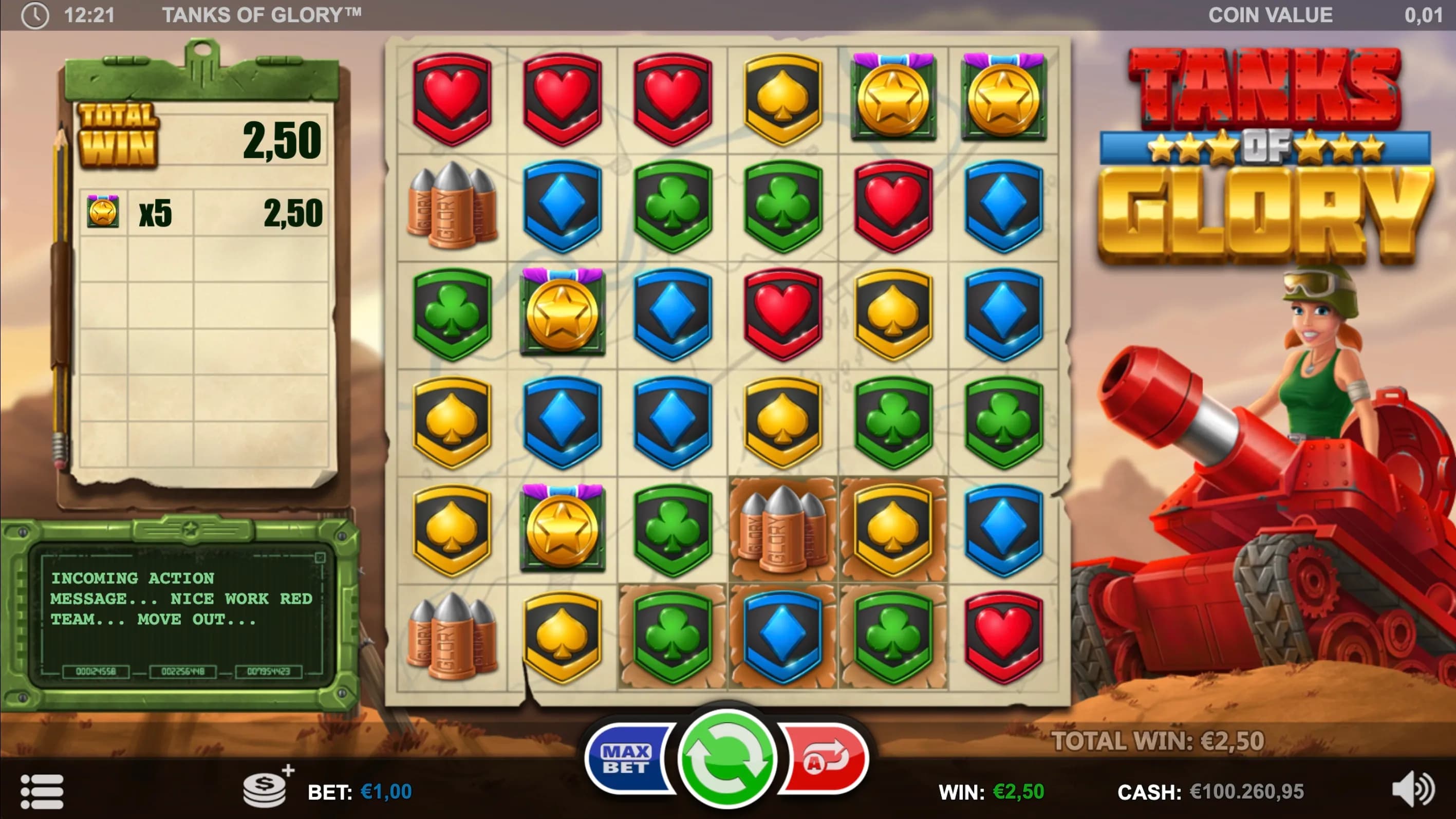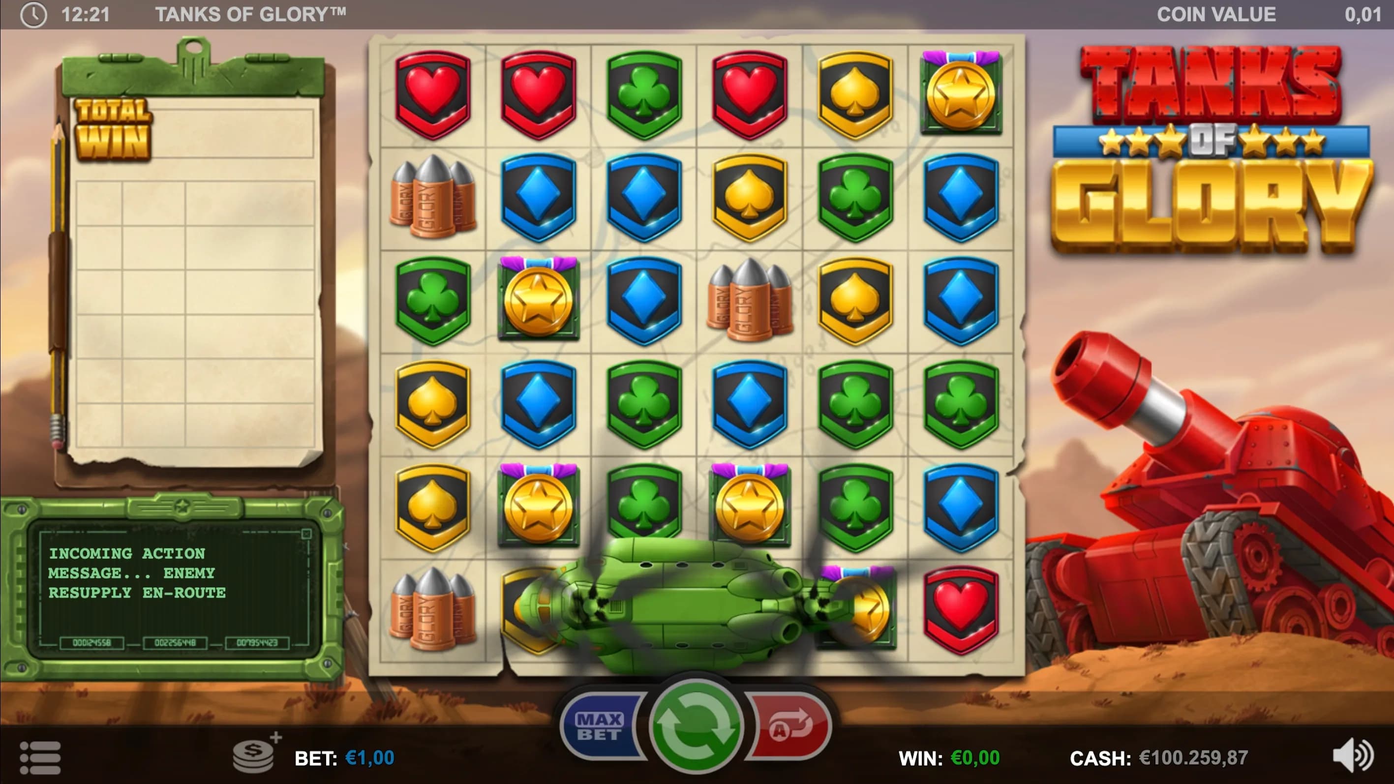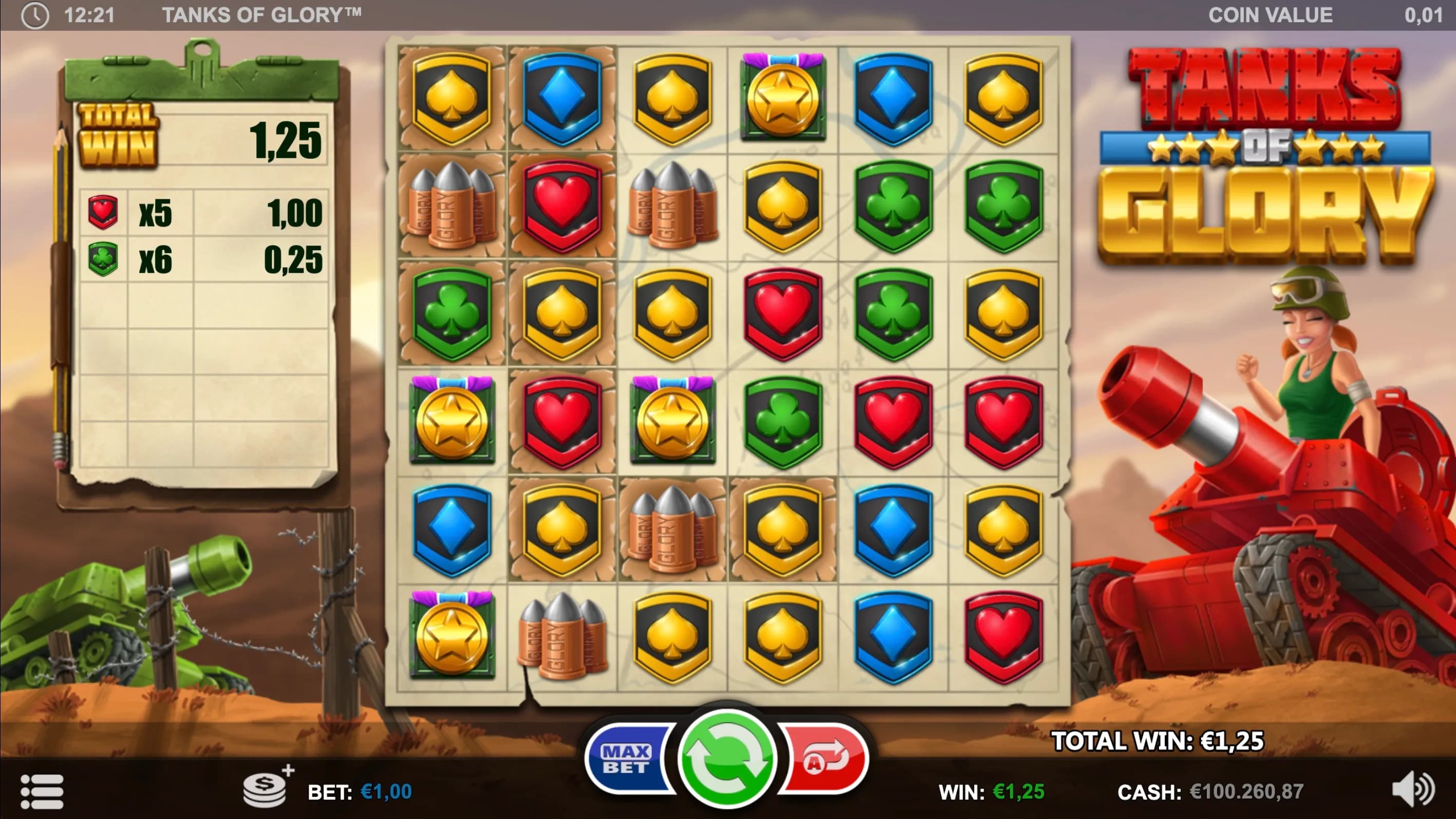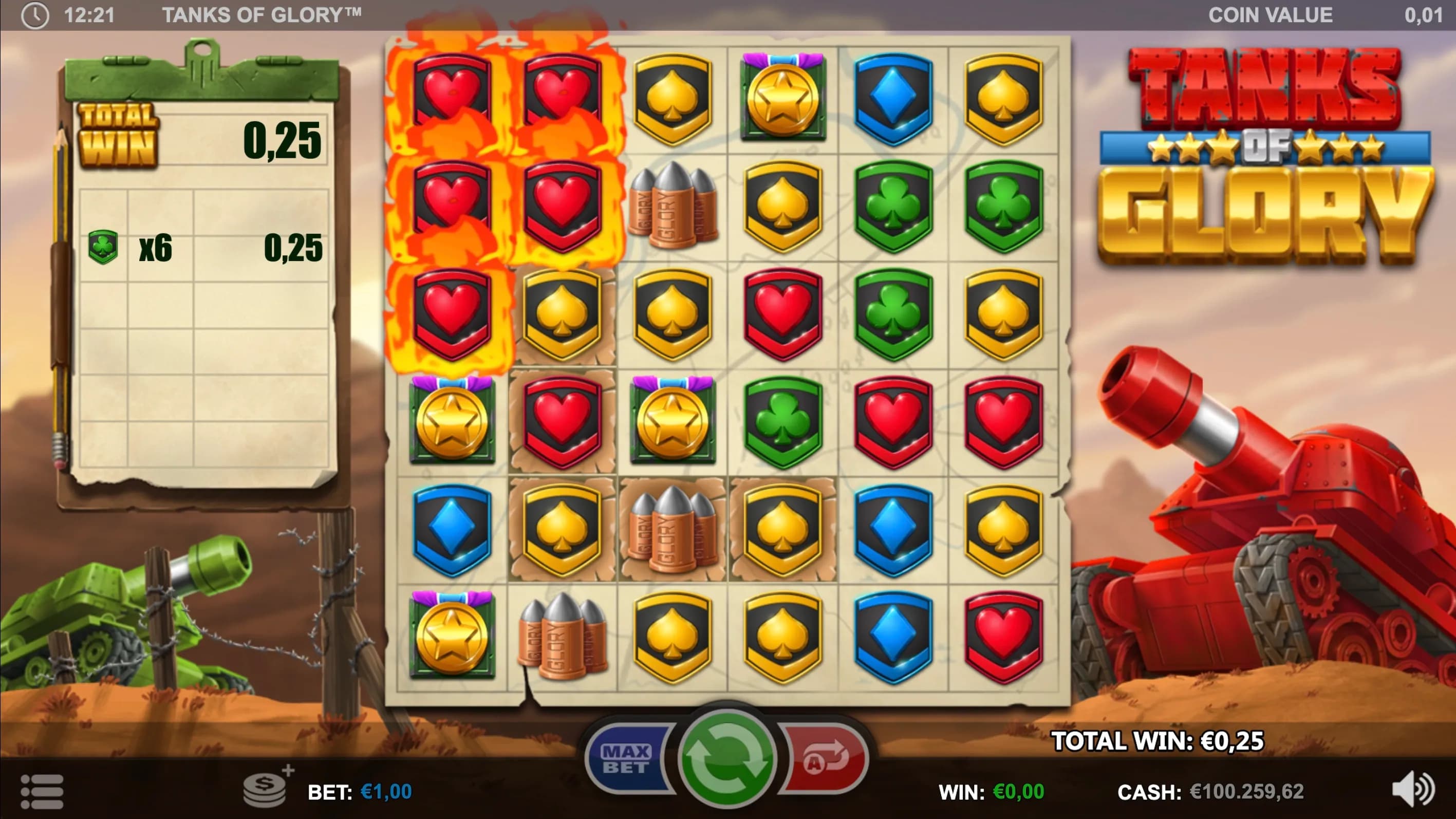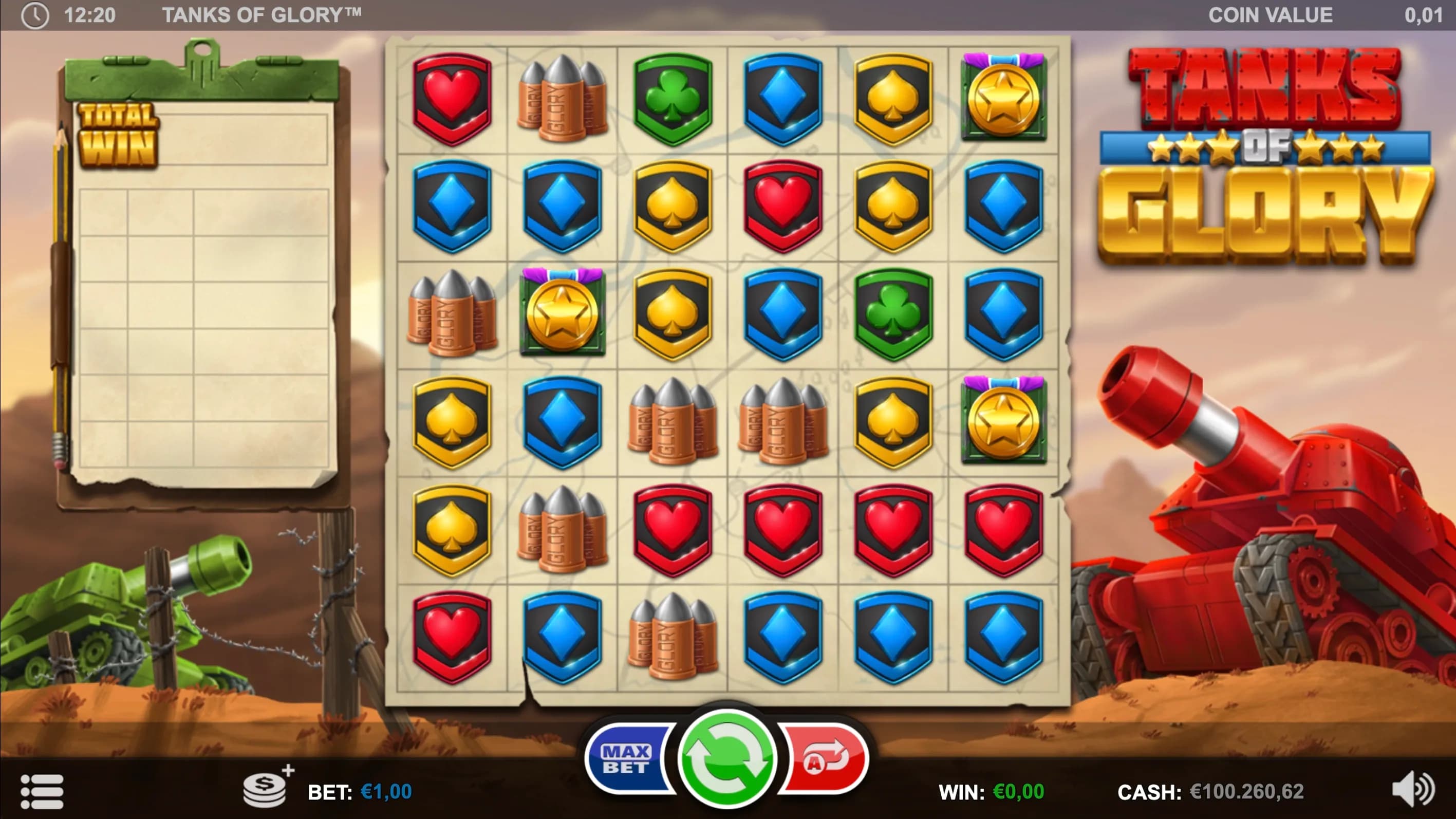 Roll into battle in Tanks of Glory, a 6x6 cascading cluster slot where explosive tank duels and wild bombardments dominate the reels, with instant wins, wild trails, and a tank-fueled chain reaction of glory!